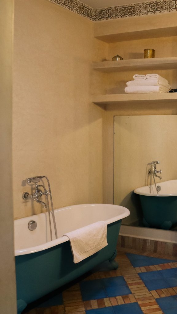 This suite, which spreads along an immense sunny terrace, boasts harmonious lime greens and yellows, playing subtly on the links between the outside and inside. The pictures and old posters evoke traditional Morocco, which Pierre Loti discovered in the medina of Fez.